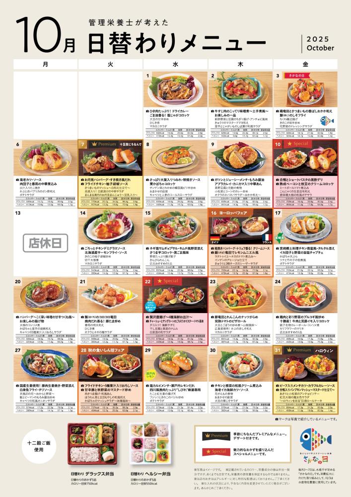 新鮮な肉や魚、旬の野菜などをとりいれ、揚げ物は身体に良い米油を、お米は契約農家さんの美味しいコシヒカリを使用しています。毎日、飽きのこない手作りのお弁当をお届けします。